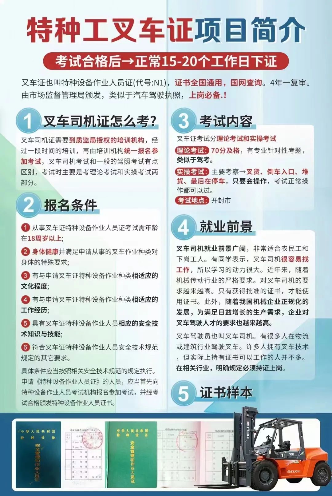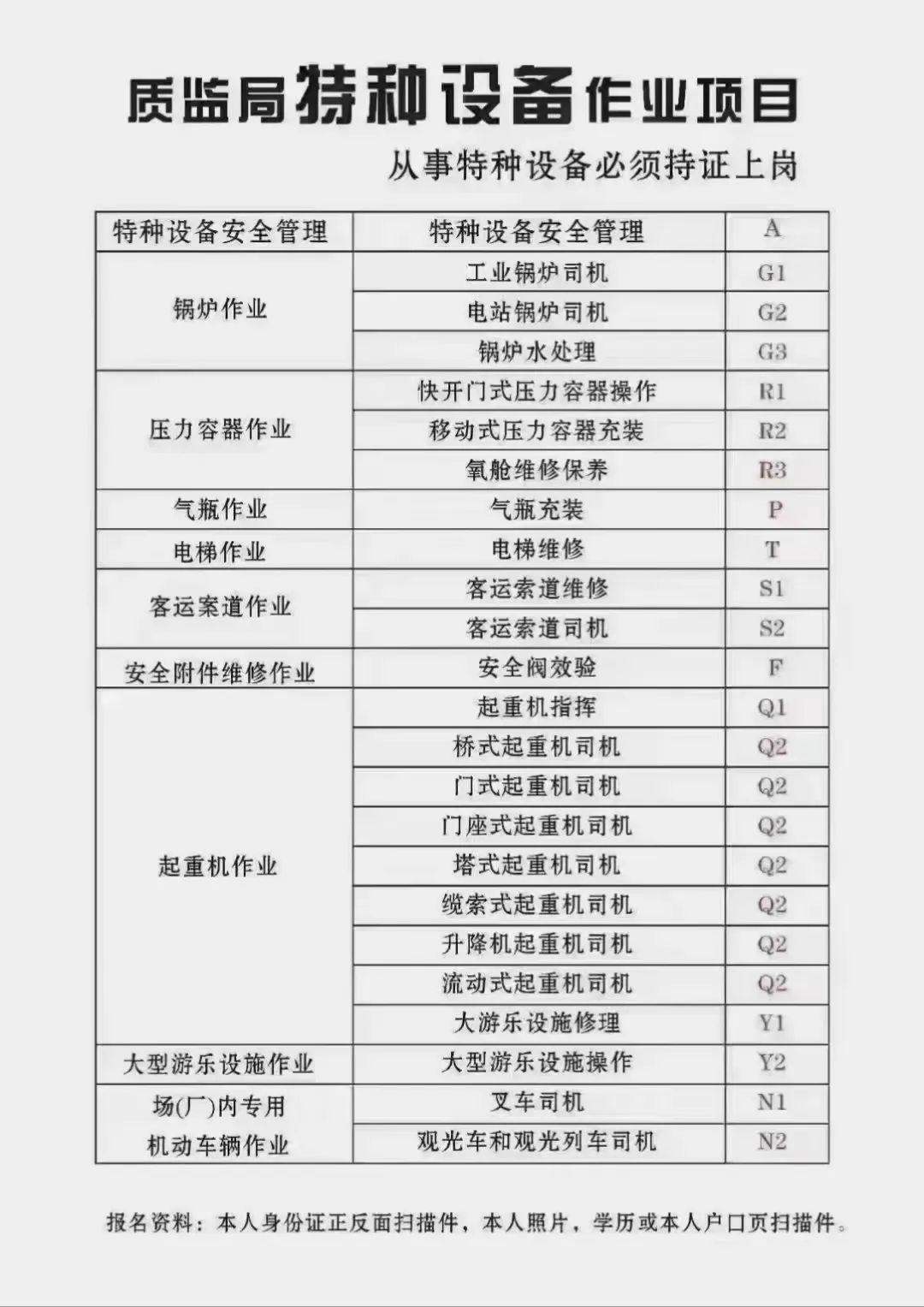 报名工种:电梯安全管理、起重机械安全管理、场(厂)内专用机动车辆安全管理、工业锅炉、快开门式压力容器操作、起重机械指挥、起重机司机(限桥式起重机)、起重机司机(限门式起重机)、叉车司机。