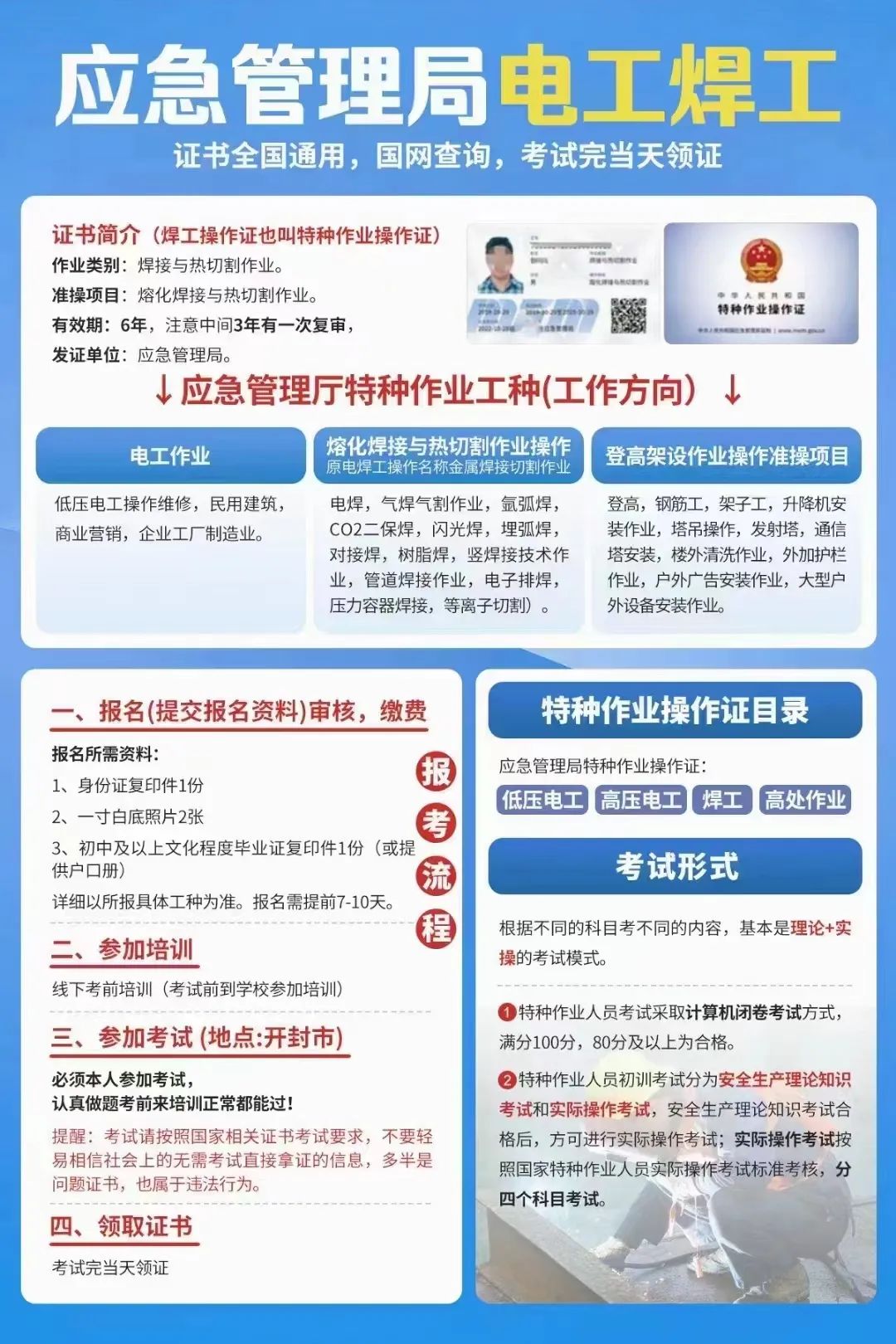 报名工种:高压电工作业,低压电工作业,熔化焊接与热切割作业,登高架设作业,高处安装、维修、拆除作业。