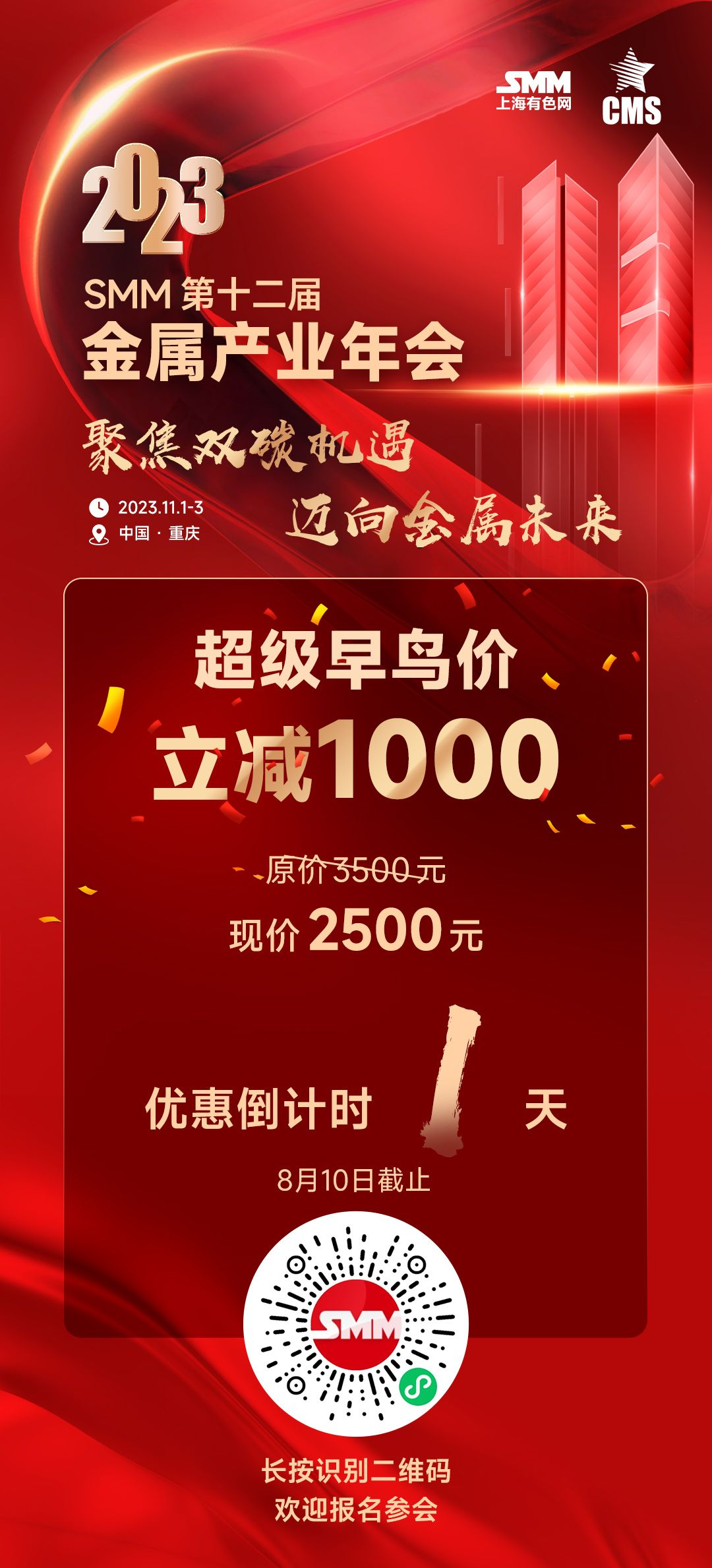 2023 SMM金属产业年会,将于11月1-3日,在重庆召开,会议聚焦金属价格行情、市场趋势、贸易形势、行业政策和低碳技术等热点话题,邀请到行业专家、学者、企业大咖、宏观经济学家和资深分析员等专家做主题演讲。除会议论坛外,还特设企业供需洽谈、长单之夜、 金属嘉年华等环节。现有超级早鸟票(报名立减1000),欢迎大家报名参与2023金属产业年会
