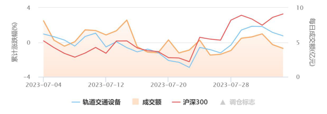 中国交建重庆轨道交通15号线二期工程项目装载机租赁招标公告中铁电气化局集团有限公司重庆轨道交通4号线弱电系统设施设备运行保障服务项目(ZHJK-5)材料采购询价上海轨道交通11、13、16号线应急电源设备更新改造招标北京经纬信息技术有限公司武汉市轨道交通19号线工程乘客信息系统网络设备采购项目公开招标公告根据东财二级行业指数轨道交通设备(802097.EI),2023年7月份最高在307.42,7月份最低在291.85,整体涨跌幅为2.28%,整体成交量为148,577.49万股,成交金额为1,092,510.52万元。