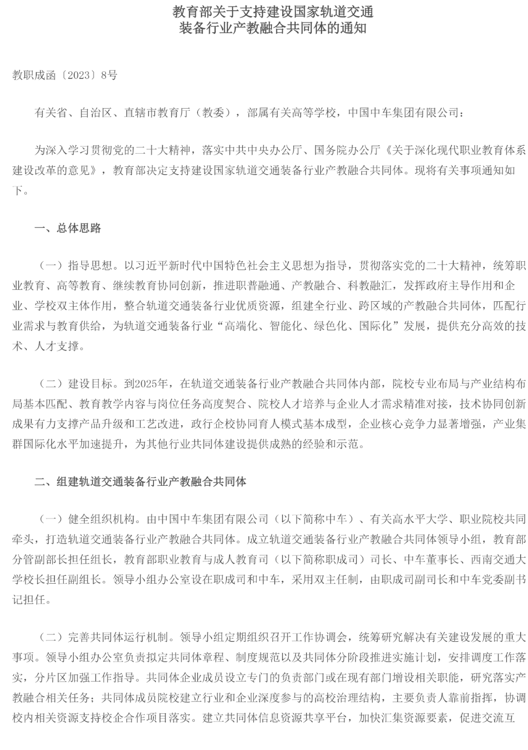 2023年7月,政策推动产教融合共同体建设迈出重要一步,市场动态展现出轨道交通设备企业成长的蓬勃活力。从行业政策的解读到重点企业的动态跟踪,再到资本市场的涨跌动态,本月的轨道交通设备行业透露着一系列引人瞩目的变化。从技术创新到市场竞争,从企业战略到资本投资,皆在影响着这个快速发展的行业。2023年7月6日,中华人民共和国教育部发布《关于支持建设国家轨道交通装备行业产教融合共同体的通知》。要点解读:统筹职业教育、高等教育、继续教育协同创新,推进职普融通、产教融合、科教融汇,发挥政府主导作用和企业、学校双主体作用,整合轨道交通装备行业优质资源,组建全行业、跨区域的产教融合共同体,匹配行业需求与教育供给。为轨道交通装备行业“高端化、智能化、绿色化、国际化”发展,提供充分高效的技术、人才支撑。2023年7月26日,马鞍山先进轨道交通装备产业基地被评为“AAA”级。动态解读:马鞍山经开区先进轨道交通装备产业集聚发展基地是由安徽省政府批准建设的首批战略性新兴产业基地之一。截至2023年,该基地纳入省监测范围规模以上企业79家,其中50亿元以上企业1家,10亿元以上5家。马鞍山经开区将紧紧围绕打造“龙头+配套”产业生态圈,依托马钢交材等领军企业在轨道交通产业技术、装备、市场领先的优势,全面提升轨道交通产业的集群化、高端化、数字化、绿色化发展水平,加快推动基地高质量发展,打造成为长三角地区有重要影响力的轨道交通装备产业高科技创新示范基地。2023年6月28日,由深铁集团、中国通号共同出资成立的深铁信号科技(深圳)有限公司揭牌成立。动态解读:动态深铁信号成立标志着深铁集团和中国通号将共同努力为深圳轨道交通装备产业高质量发展添薪续力。深铁信号作为央企和地方国企战略合作的范例,将立足助力深圳发展壮大战略性新兴产业集群和培育发展未来产业,充分把握轨道交通装备产业在自主化、智能化、绿色节能化方面迭代升级的战略性机遇,发挥深铁集团在“三铁”业务领域以及中国通号在轨道交通全产业链、全自主化成套技术等方面的先进经验和独特优势,着眼轨交行业未来发展趋势开展前瞻性和突破性的技术研究和装备制造。深圳市城市轨道交通3号线四期综合监控及MCC系统设备采购及服务项目招标中国电建铁路公司穗莞深城际轨道交通深圳机场至前海段工程施工总承包工程、穗莞深城际轨道交通前海至皇岗口岸段工程制冷设备采购项目竞标公告