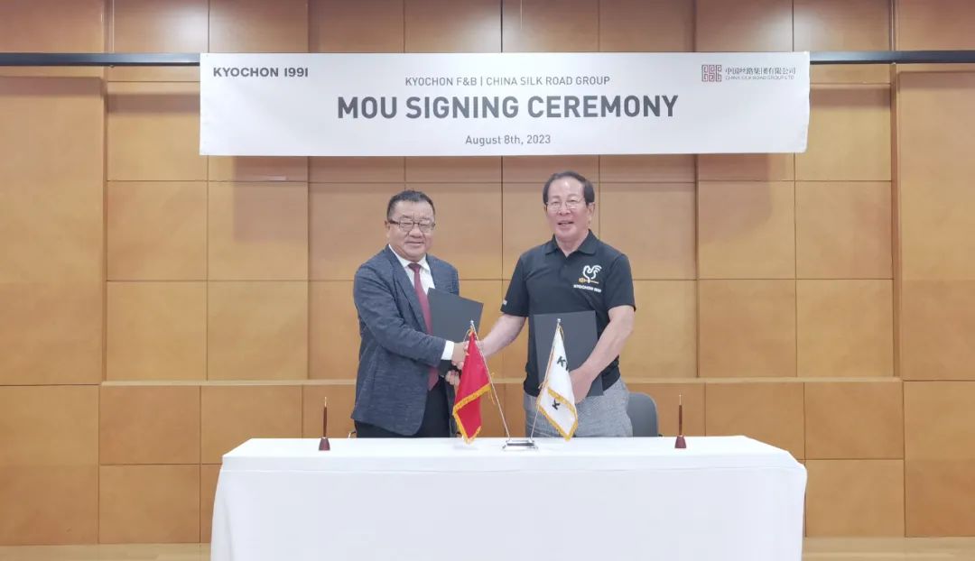 2023年8月8日,中国丝路集团与韩国知名品牌“校村炸鸡KYOCHON”在韩国京畿道乌山市校村炸鸡会社总部签署战略合作协议。这一合作标志着两家企业将展开密切合作,共同开拓国际市场,推动中韩快消品行业的合作,并促进两国之间的文化交流。