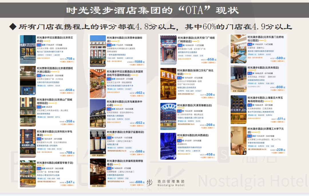 疫情期间,时光漫步酒店集团投资1.3个亿,打造了8家直营门店。所有门店在携程上的评分都在4.8分以上;其中60%的门店在4.9分以上;所有门店在美团上的评分都在5.0分以上;所有门店在飞猪上的评分都在4.9分以上。