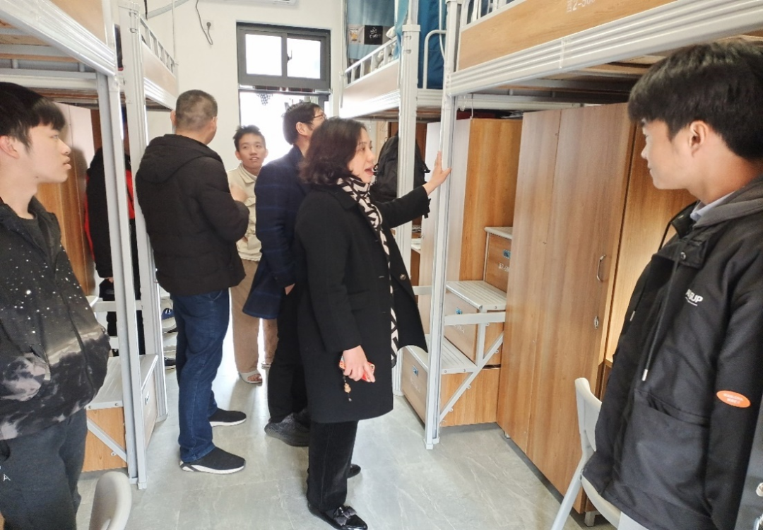 院领导一行走进学生宿舍,首先对宿舍卫生情况进行查看,亲切询问学生们宿舍设施是否有破损,并仔细查看是否存在安全隐患。他们与同学们亲切交流,对干净整洁的宿舍给予赞扬。临近期末,刘卫红叮嘱同学们要加强各学科的复习备考,同时也要劳逸结合,加强锻炼。院长黄金火提醒同学们要注重个人卫生及内务整理,共同营造一个干净整洁的宿舍环境,寒假放假离开一定要断水断电,关好门窗。