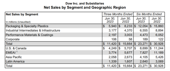 陶氏发布2023年第二季度业绩表明,公司第二季度的净销售额为114亿美元,对比去年同期下降27%。所有运营部门均出现下滑。对此陶氏给出的原因是,由于宏观经济活动放缓,需求和价格的下降。而由于需求下降以及全球能源和原料成本的下降,导致了细分市场和地区的价格也有所下降。此外,陶氏公布的细分市场领域相关数据还是很值得参考的。包装与特种塑料部门本季度净销售额为59亿美元,比去年同期下降28%。主要是由于全球能源和原料成本下降,所有地区乙烯和聚乙烯价格下降,当地价格同比下降21%。其次,由于烯烃和芳烃需求下降,在中东和非洲地区的销量同比下降7%。亚太地区和拉丁美洲的销量增长被第三方能源销售额的下降所抵消,环比而言,净销售额下降了3%。包装和特种塑料业务报告净销售额较上年同期下降的另一个原因是,各地区的聚乙烯价格因投入成本下降而下降。随后,由于软包装领域全球聚乙烯需求增加以及许可收入的推动,净销售额有所增加。在中东和非洲地区,受到烯烃和芳烃销售下降的推动,碳氢化合物和能源业务的净销售额与去年同期相比有所下降。