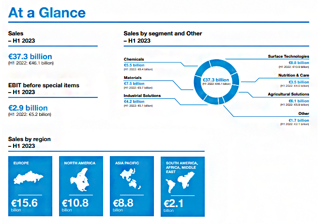 根据巴斯夫的半年度财务报告,2023年上半年销售额为372.97亿欧元;与去年同期相比,减少了87.61亿欧元。销售额下降主要归因于需求下降导致所有细分市场的销量大幅下降。其中,化学品和材料领域的销量远低于2022年上半年的水平。由于原材料价格下降造成的价格下降(主要是化学品、表面技术和材料领域)是导致巴斯夫销售额下降的一个原因。此外,销售业绩还受到货币影响的影响。而大幅价格上涨的农业解决方案领域也不能补偿整体的销售额。