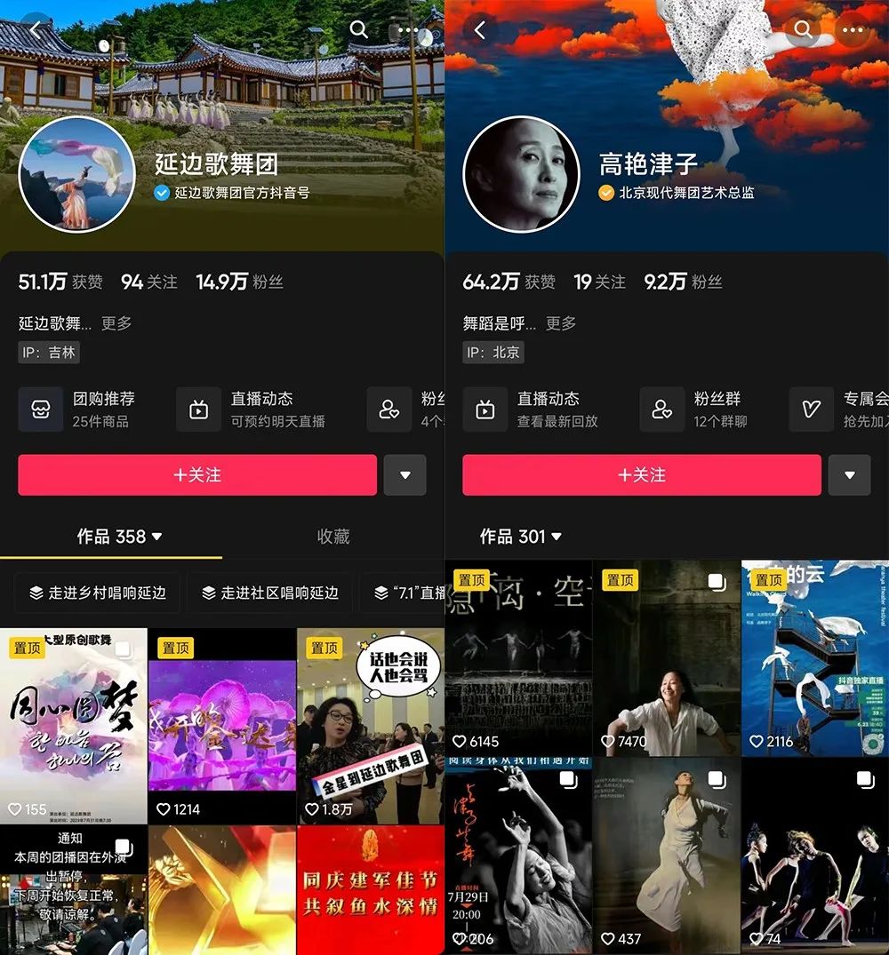 直播间正在成为舞蹈演出的第二舞台。值得关注的是,专业院团、舞蹈艺术家也越来越多地通过直播与观众见面。本次活动导师咸顺女所在的延边歌舞团,2022年开启首场抖音直播,目前已有近15万粉丝,获赞超过51万,单场直播最获超过100万人次观看。最近,延边歌舞团又加入了抖音直播“艺播计划”,进一步拓展线上舞台。导师高艳津子在抖音有9.2万粉丝,她在直播间带着粉丝们一起席地跳舞,热度最高时,一个多小时就有8万多人观看,点赞量超过40万。