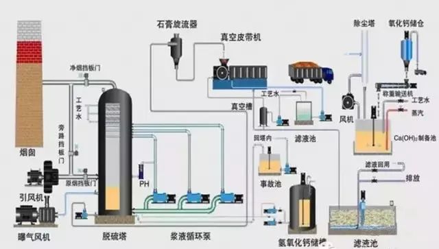 原理:是利用石灰石或石灰浆液吸收烟气中的SO2,生成亚硫酸钙,经分离的亚硫酸钙(CaSO3)可以抛弃,也可以氧化为硫酸钙(CaSO4),以石膏形式回收。是目前世界上技术最成熟、运行状况最稳定的脱硫工艺,脱硫效率达到90%以上。