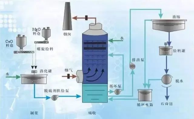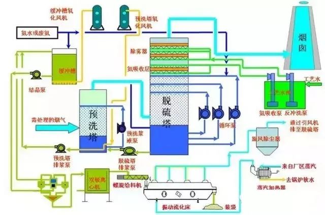 该工艺主要由脱硫洗涤系统、浓缩系统、烟气系统、氨贮存系统、硫酸铵生产系统(若非氨-硫铵法则是于其工艺相对应的副产物制造系统)、电气自动控制系统等组成。
