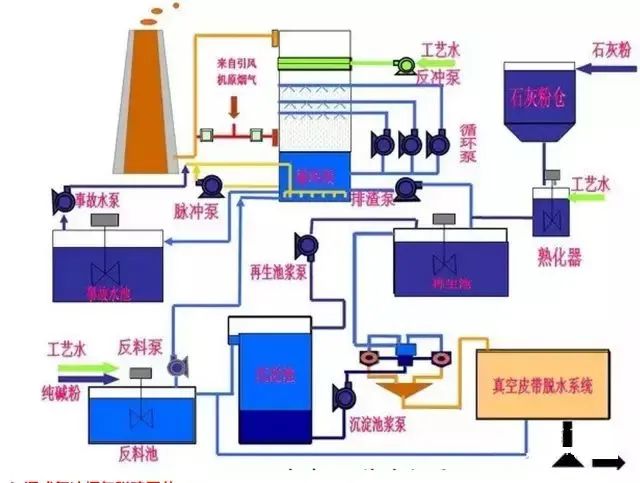 缺点:生成物是液体或淤渣,较难处理,设备腐蚀性严重,洗涤后烟气需再热,能耗高,占地面积大,投资和运行费用高。系统复杂、设备庞大、耗水量大、一次性投资高,一般适用于大型电厂。