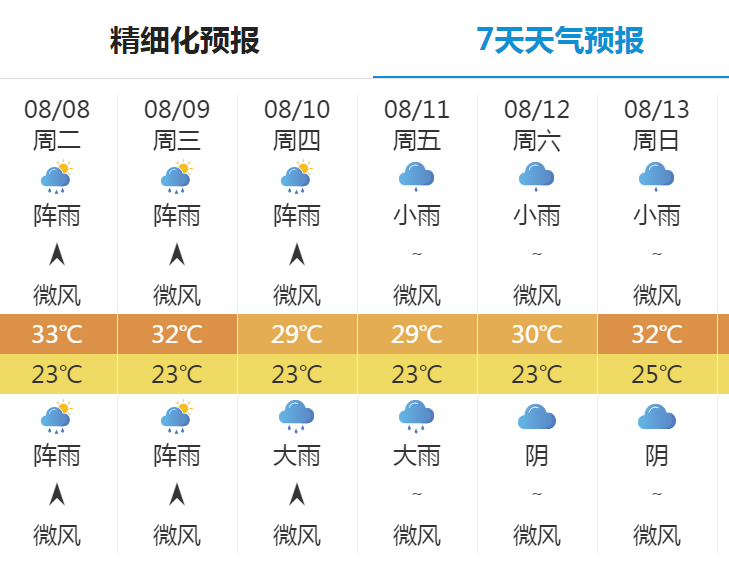 8月9日白天多云间阴,有分散阵雨或雷雨,气温24~32℃;9日晚上多云间阴,有分散阵雨或雷雨,气温23~28℃。