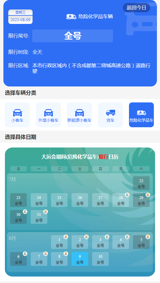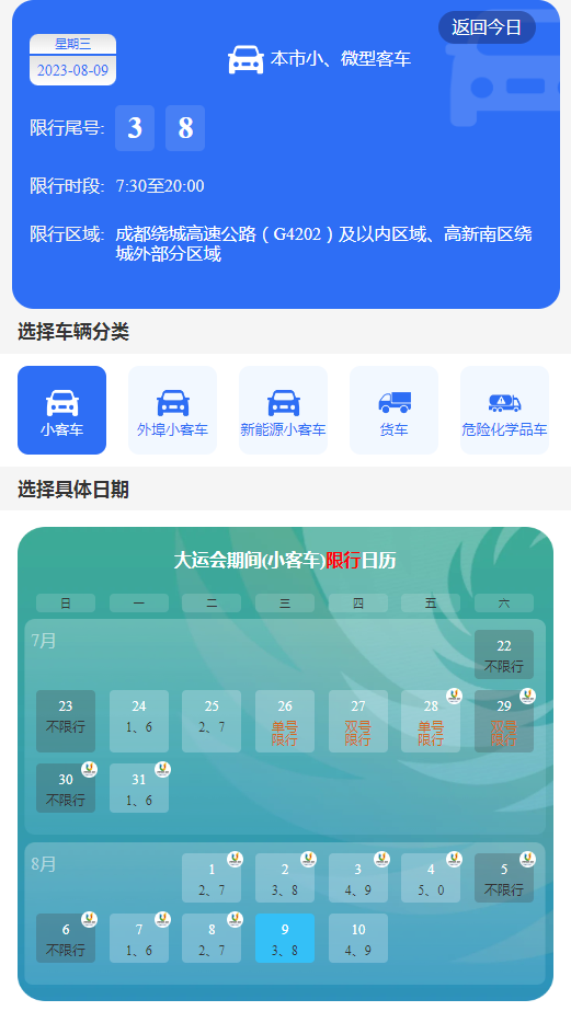 8月9日星期三,机动车尾号限行3和8,限行范围:成都市绕城高速公路及以内的区域、“成都高新南区绕城外部分区域”所有道路,外埠小客车(不含新能源汽车)全号段禁止在限行范围内行驶。