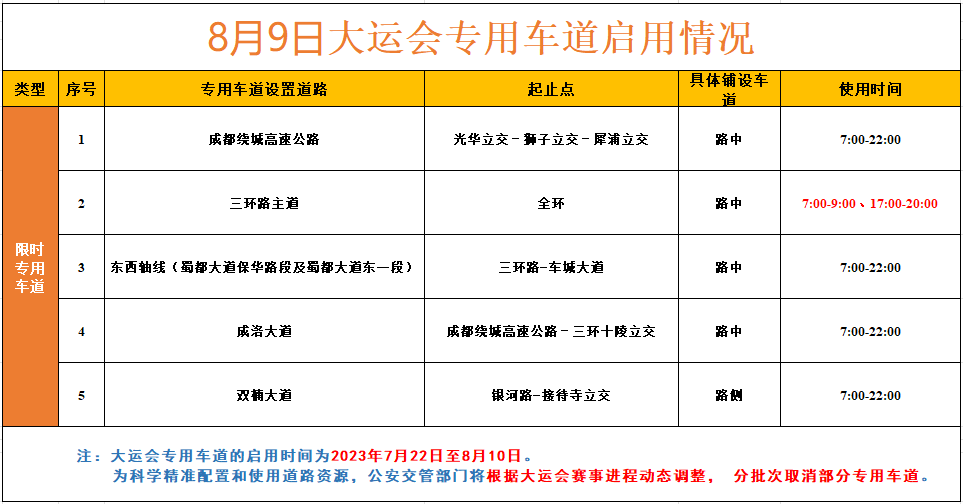 根据成都大运会赛事进展情况,公安交管部门将于2023年8月9日起取消部分大运会专用车道。目前,仍在用的大运会专用车道有:三环路主道(全环)、蜀都大道保华路段及蜀都大道东一段(三环路-车城大道双向)、成都绕城高速公路(光华立交-狮子立交-犀浦立交双向)、成洛大道(成都绕城高速公路-三环十陵立交双向)、双楠大道(银河路-接待寺立交双向)。