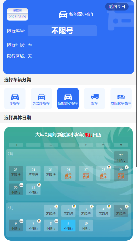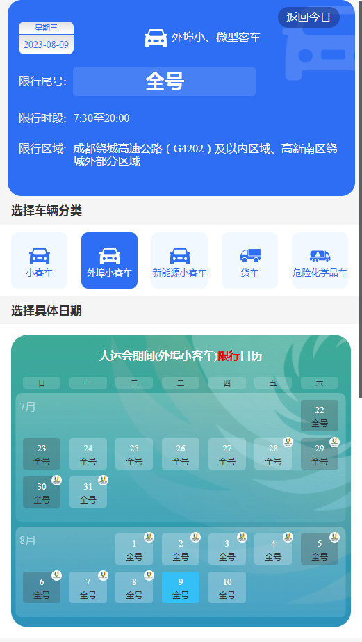 三、2023年7月26日至7月29日,每日7:30至20:00,在成都绕城高速公路(G4202)及以内区域、成都高新南区绕城外部分区域所有道路,小、微型载客汽车按机动车车牌(含临时号牌)最后一位阿拉伯数字,实行“单号单日、双号双日”行驶(单号为1、3、5、7、9,双号为2、4、6、8、0)。网约车不受上述限行规定限制。