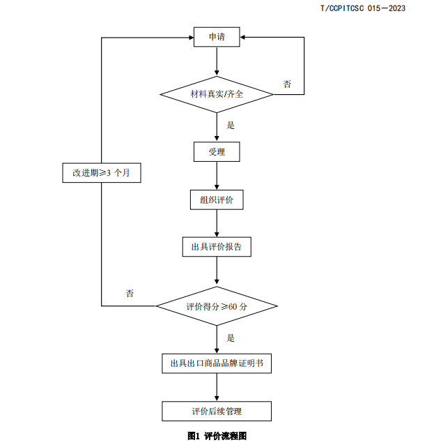 评价流程主要包括申请、受理、组织评价(首次评价、复审评价)、出具评价报告、出具出口商品品牌证明书、评价后跟踪,见图1。