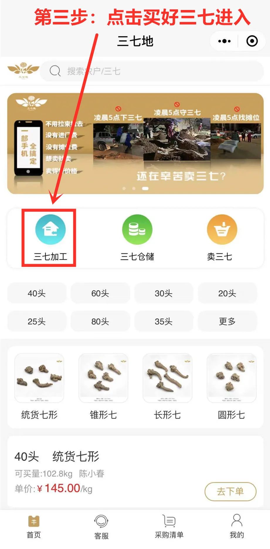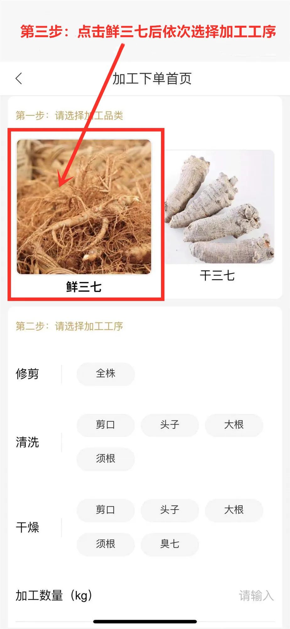 第三步:点击“鲜三七”后依次选择加工工序完成下单