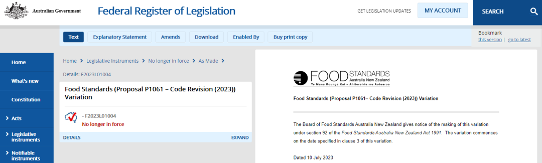 2023年7月19日,澳大利亚联邦公报发布F2023L01004号公告,对澳新食品标准法典的修订。修订了法典附表20(食品中农药最大残留限量标准),该公告自发布之日起生效。