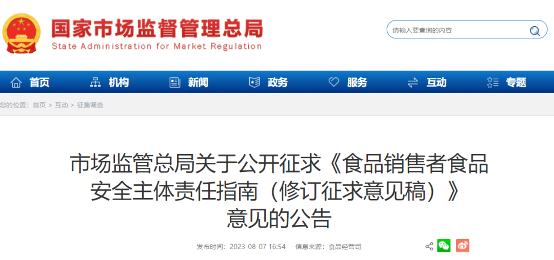 8月7日,市场监管总局在其网站发布公开征求《食品销售者食品安全主体责任指南(修订征求意见稿)》意见的公告, 意见反馈截止日期为2023年8月13日,详情如下: