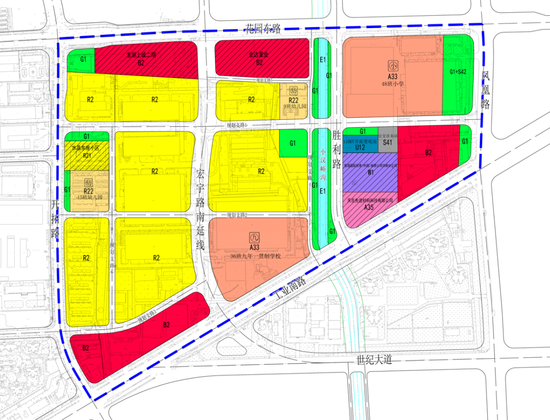 2.胜利路(金达路)以东部分:花园路南侧规划为了48班小学;小学东南侧有一处面积较大的商务用地,建筑限高130米;小学南侧增加了变电站和公交车场;凤凰路沿线为绿地公园及社会停车场。