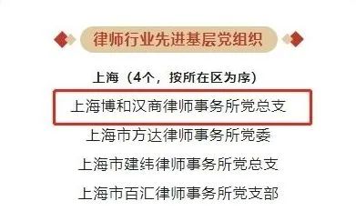 近日,司法部召开律师行业党建工作先进典型表彰会暨律师行业东中西部对口帮扶工作推进会。会上,律师行业97个先进基层党组织和100名优秀共产党员、60名优秀党务工作者受到表彰。其中,上海博和汉商律师事务所党总支被全国律师行业党委评为“律师行业先进基层党组织”。