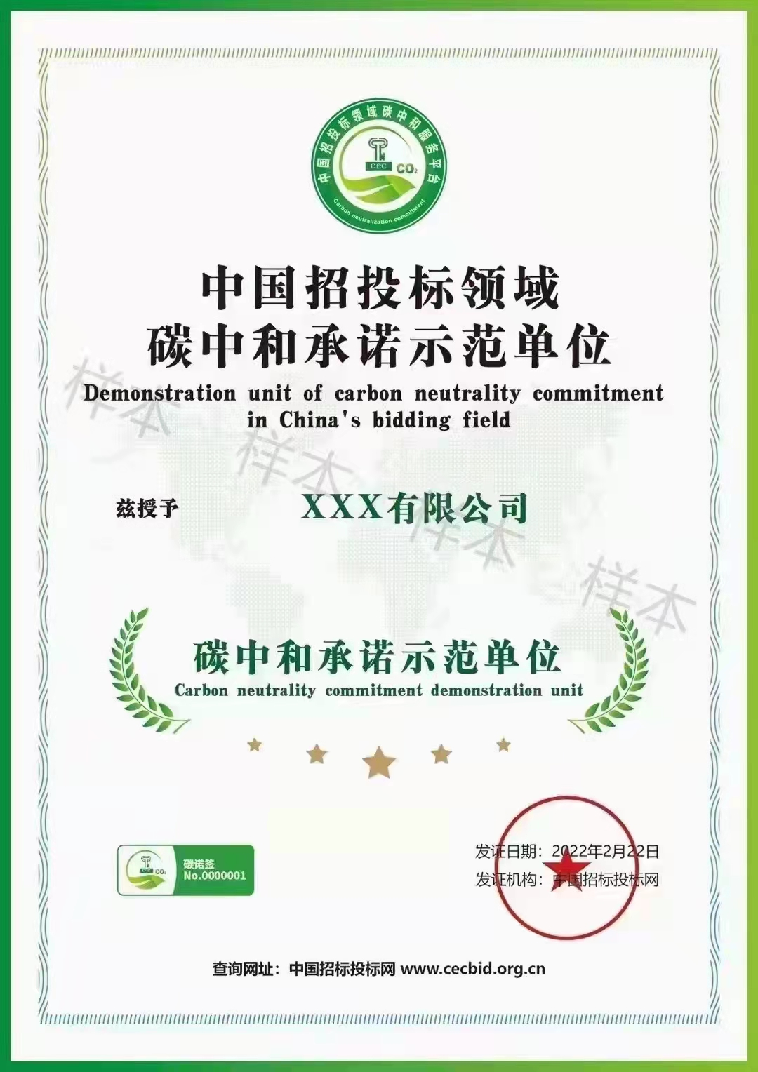 为响应国家政策,履行承诺,发挥示范引领作用,目前工信部中国招标投标网开始征集碳中和承诺示范单位,对实施企业进行自愿碳排放等相关承诺,并在中国招标投标网展示,证书可作为国家承诺2060年达成碳中和目标首批企业碳中和承诺示范单位参与投标加分。