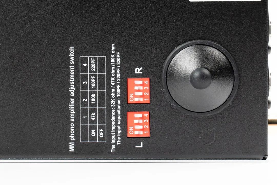 使用界面部分,IA-9X 也给足了方便性,除了具有 2 组 RCA 非平衡输入和 1 组 XLR 平衡输入外,并提供 1 组 RCA 的 MM 唱头输入,以便连接黑胶唱盘。不仅如此,IA-9X 的 MM 唱放电路还可以调整对应唱头的输入阻抗与容抗,调整开关位在底部,阻抗有 32k、47k、100k 三段,容抗有 320pf、100pf、220pf 三段,应可应付各种的 MM 唱头。