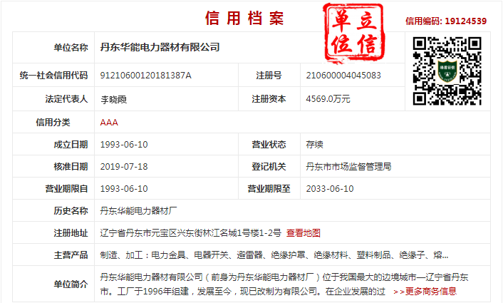 丹东华能电力器材有限公司(前身为丹东华能电力器材厂)位于我国最大的边境城市—辽宁省丹东市。工厂于1996年组建,发展至今,现已改制为有限公司。在企业发展的过程中,跟踪市场变化,抓紧技术改造和机制创新,于1999年通过了ISO9001国际质量体系认证,并于2002年完成了ISO9001:2000版的转换,2003年经国家电力部检验测试中心的检测,取得了国家电力金具生产许可证,从而为各种产品的高质量提供了可靠的保证。