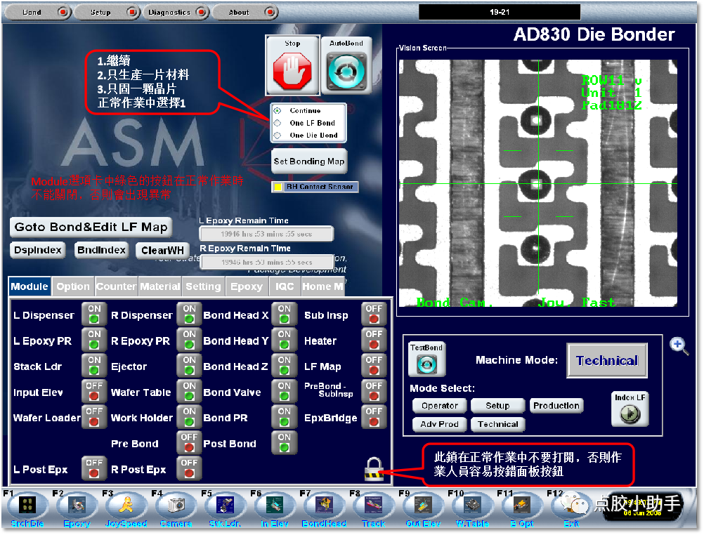 <F4>影像机窗口选择,控制屏幕显示的当前影像在左、右点胶、固晶、晶环影像之间切换