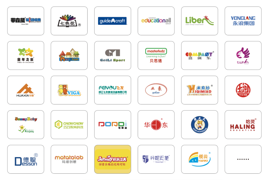包括华森葳、七色花、Guidecraft、贝思德、欧蒙、传承、唯一嘉、溢轩、科迪普、Weplay、HABA、Beleduc、Educo、Poly-M、TopPlay、ECR4KIDS、Little tikes、HIDE & SEEK KIDS、芳草教育、爱立方、洪恩、玛塔、火星科学盒、奇特乐、海基伦、立本、永浪、飞友、巧巧教育、幼步、华夏游乐、万德体育、育才、培乐迪、给力、加怡等在内的国内外知名品牌均已确认参展。