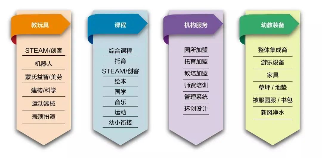 参展品类从教玩具、家具、游乐设备、草坪地垫、园服被服等硬件资源到幼教课程、绘本、线上教育等内容类产品以及幼教/托育加盟、环创设计、师资培训等幼教服务,覆盖所有幼教机构运作需要的软硬件体系。