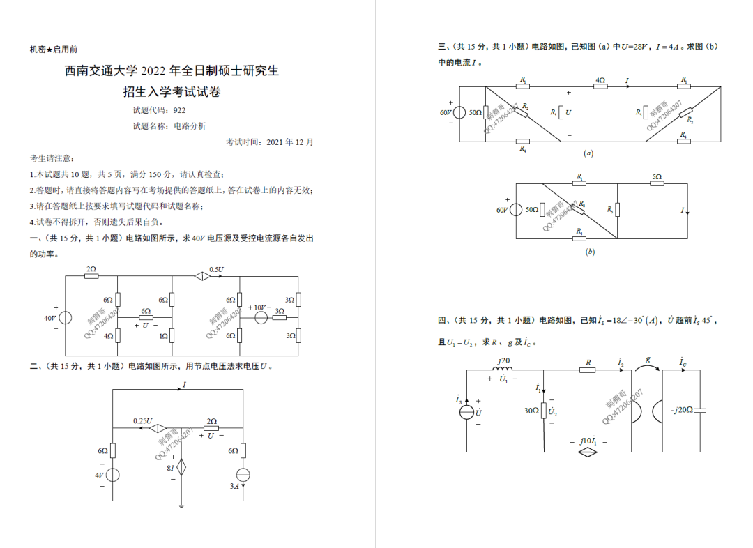 ①101思想政治理论 ②201英语一 ③301数学一 ④922电路分析