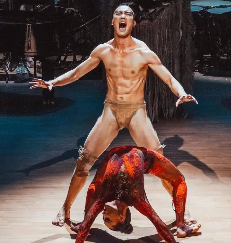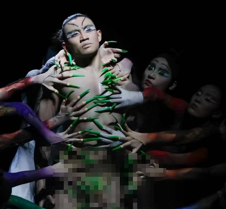 因为新的舞蹈中,男舞伴又是全身没有衣服,而一堆女孔雀伸长绿色的“爪子”捂住了他整个身体。