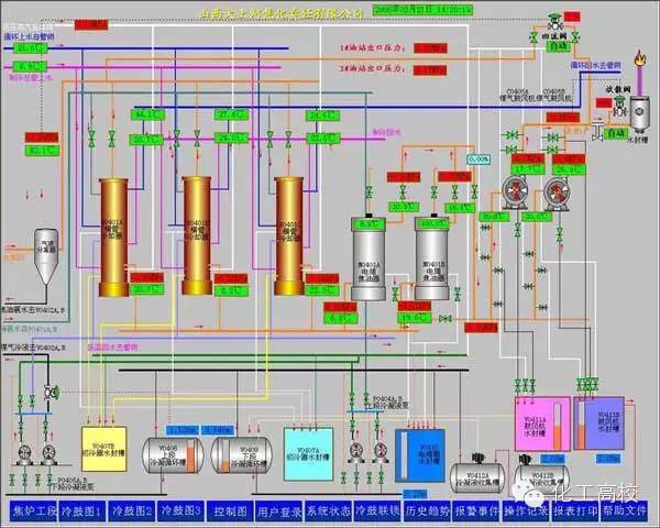 TT: 管式炉焦油出口温度控制:这是蒸馏过程中最重要的控制环节。采用串级控制,T2为炉膛温度,作为串级控制的内环,它反应了炉膛温度的快速变化,T1为管式炉出口温度,作为内环,变化较慢,产生精调作用,理想情况下控制误差仅在1至2℃范围内,完全可以满足工艺控制要求。