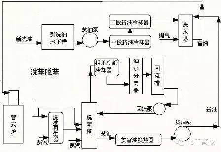 洗苯脱苯的工艺流程是贫富油经洗苯塔清洗后进入脱苯塔,利用温度的不同产生轻苯油水和重苯油水,经油水分离器进行分离。