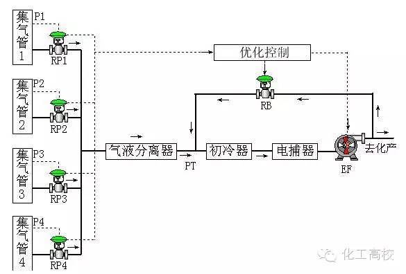 图中P1至P4是集气压力值,是本系统控制之重点,P是集气管压力之平均值,它反映了集气管的一般工作状态,在“4+1”控制中(“4”代表四个集气管,“1”代表选择大回流调节阀RB还是液力偶合器EF控制,两者必选其一),时间分配器根据集气管压力的变化:偏差和偏差变化率,根据液偶调速慢的特点,适当地分配大回流与液偶的调节量。集气管压力变化的特点是:瞬态变化大,调节时互相产生耦合,本控制算法设计有一个解耦算法,可减少或消除耦合,以保证各个单回路系统能独立地工作,该控制算法采用经典控制理论与离散控制理论相结合的优化控制方法,取得了良好的控制效果。