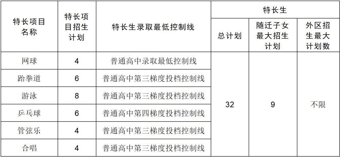共招32人,涵盖网球、跆拳道、游泳、兵乓球、管弦乐、合唱这几个项目,对中考成绩的要求为第三梯度线(即635分)或第四梯度线(即595分)