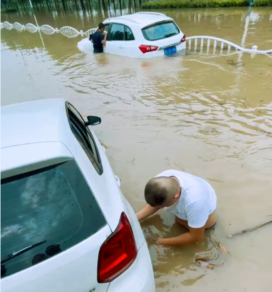 突然,不远处的积水里出现了一辆熄火的白色小轿车,车内2名儿童正在不停地拍打车窗,他们的妈妈在驾驶位焦急地打电话求助。不断上涨的水位时刻威胁着车内母子三人的生命安全。