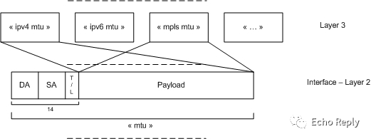 说到二层 MTU ,自然也有三层 MTU 的说法,三层 MTU 是一个三层概念,它包含了三层头部及其载荷,譬如上图中所提到的 IPv4 MTU、IPv6 MTU、MPLS MTU 等等,而 IP MTU 多指 IPv4 MTU。