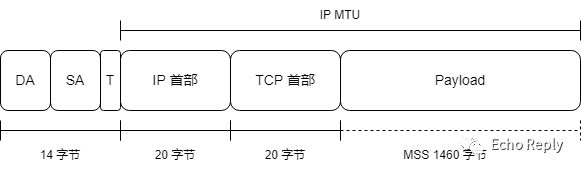 IP MTU 1500 字节 = 20 字节(IP 首部)+ 20 字节(TCP 首部)+ 1460 字节(MSS)