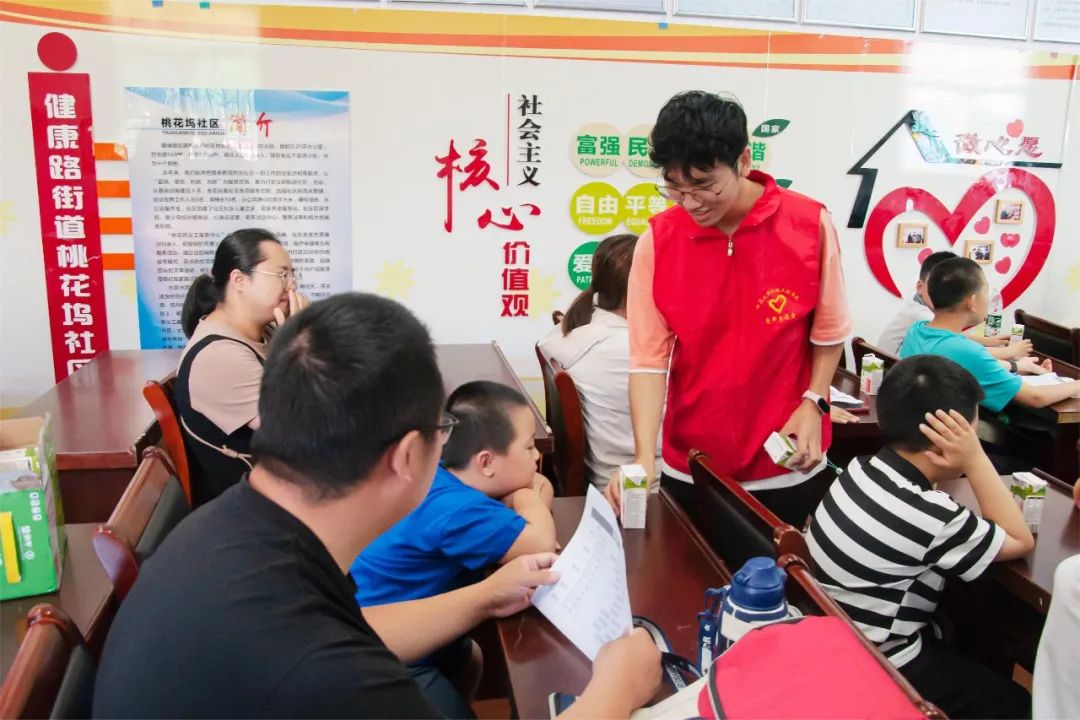 社会实践团队成员梁朝旭热情与小朋友们交流,积极了解他们的学习情况和课程需求。