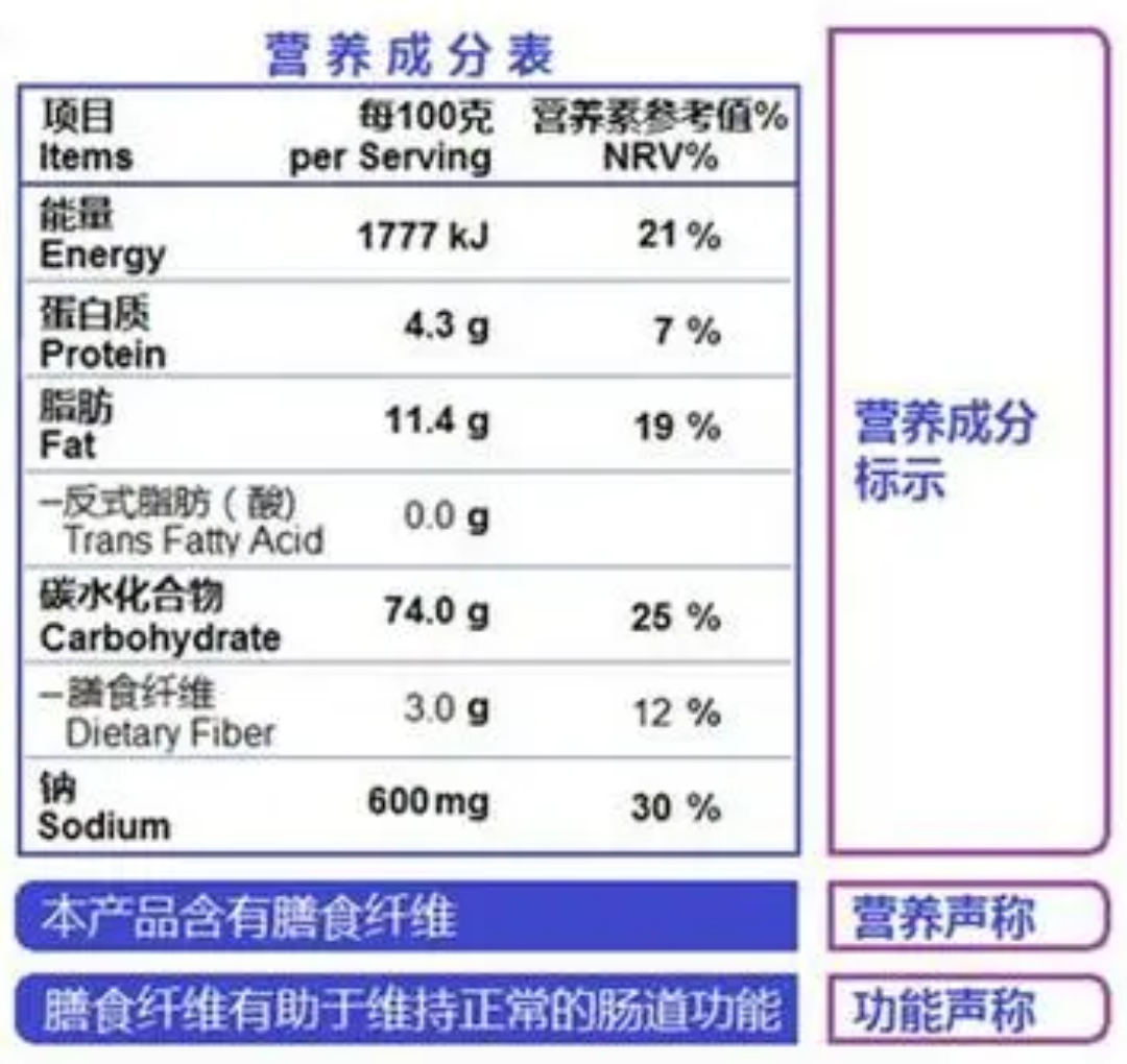营养功能声称即营养素功能的释意。如“膳食纤维有助于维持正常的肠道功能”,“维生素D可促进钙的吸收”等。营养功能声称使消费者能更直观地领会到食品的营养价值,即便是对营养素功能不太了解的消费者也能据此选购到符合自身营养需求的预包装食品。