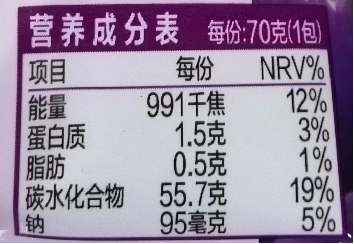 “营养成分表”是显示食物所含有的各种营养素成分的表,通常列出每百克的可食部分所含的水分、蛋白质、脂肪、碳水化合物、能量以及几种主要矿物质(钙、磷、铁)和维生素的含量。根据国家规定,能量以及蛋白质、脂肪、碳水化合物和钠四种“核心营养素”属于强制标示内容,即“1+4”,其他的营养成分(如维生素、矿物质),企业可自主选择是否标示。一般在最右侧的是营养素参考值(NRV%)表示每百克或百毫升食品中,所含的营养素占人体一天所需营养素的百分比,而不是该营养素占该食品的百分比。比如钠在中国的每日营养素参考值为2000mg,若一份食品每百克的钠含量为200mg,则其NRV%值会显示为10%。