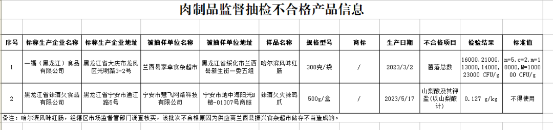 (二)绥化市兰西县家幸食杂超市销售的、标称一福(黑龙江)食品有限公司生产的哈尔滨风味红肠,其中菌落总数不符合食品安全国家标准规定。经辖区市场监督管部门调查核实,该批次不合格原因为供应商兰西县振兴食杂超市储存不当造成的。