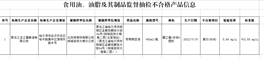 比优特商贸有限公司阿城百货大楼分公司销售的、标称黑龙江龙江福粮油有限公司生产的笨榨熟豆油,其中酸价(KOH)检测值不符合有关产品执行标准要求。