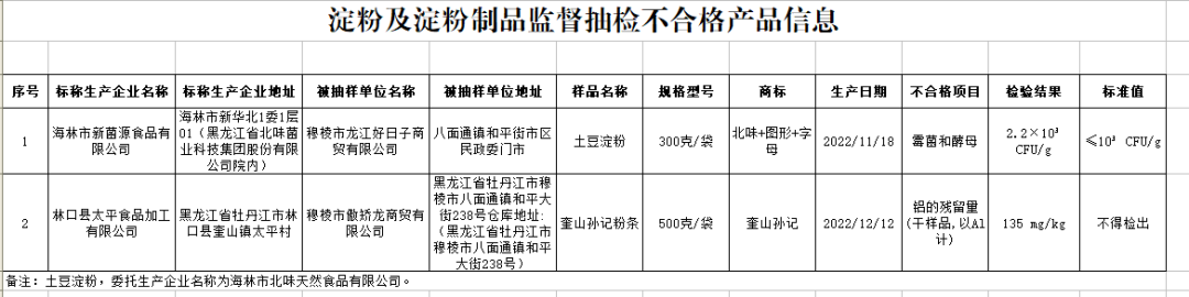 (三)穆棱市龙江好日子商贸有限公司销售的、标称海林市北味天然食品有限公司委托海林市新菌源食品有限公司生产的土豆淀粉,其中霉菌和酵母不符合食品安全国家标准规定。