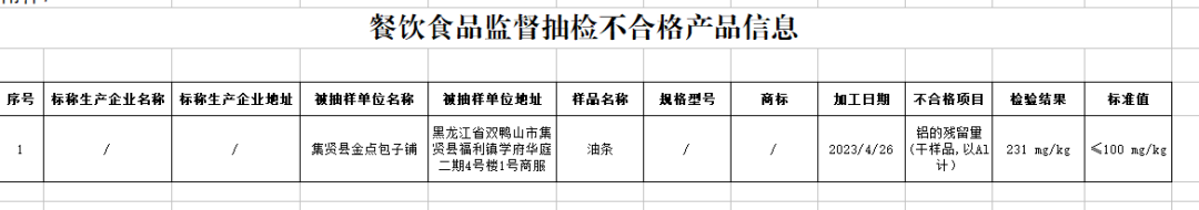 (一)双鸭山市集贤县金点包子铺自制销售的油条,其中铝的残留量(干样品,以Al计)不符合食品安全国家标准规定。