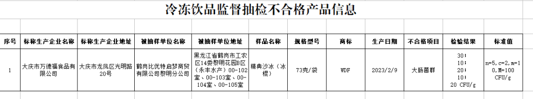 (一)鹤岗比优特启梦商贸有限公司黎明分公司销售的、标称大庆市万德福食品有限公司生产的精典沙冰(冰棍),其中大肠菌群不符合食品安全国家标准规定。