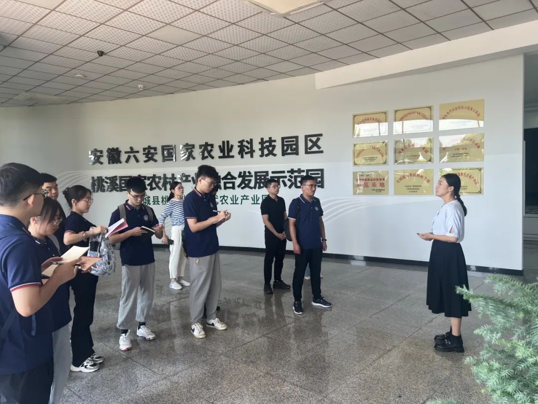 7月31日上午8点45分,实践队抵达舒城县桃溪现代农业产业园,实地调研舒城县的农村产业融合发展情况。舒城县农科所副所长阮琦琦为实践队员们介绍了产业园的发展历程、园区的整体布局,并带领大家参观了中国蜜蜂博物馆(安徽馆)和水稻试验田,全面介绍了当地的养蜂产业以及水稻培育情况。队员们切实感受到了桃溪现代农业产业园对于当地农民增收的推动作用以及乡村振兴战略背景下的使命与担当。