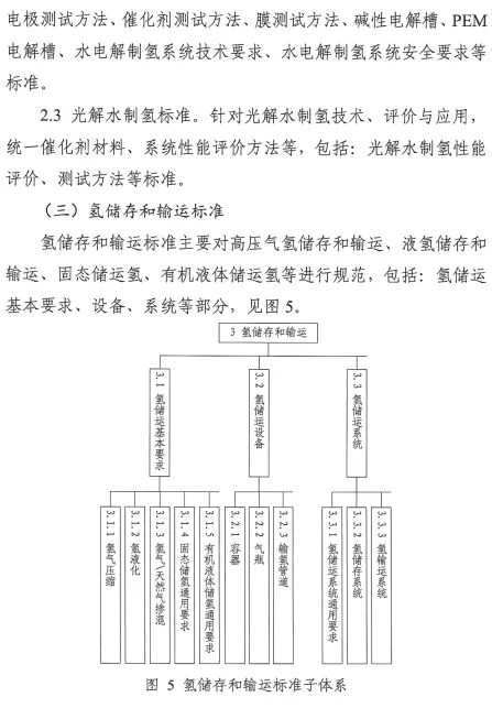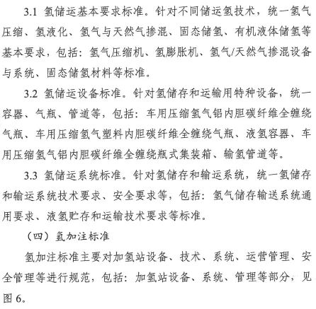 在氢储存和输运方面,主要包括氢气压缩、氢液化、氢气与天然气掺混、固态储氢材料等氢储运基本要求,容器、气瓶、管道等氢储运设备以及氢储存输运系统等方面的标准,推动安全、高效氢储运相关标准的制修订;