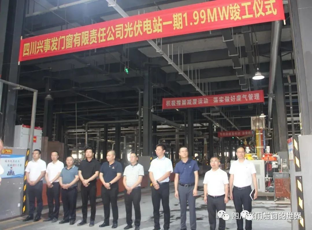 7月31日上午,四川兴事发门窗有限责任公司光伏电站一期1.99MW竣工仪式在兴事发现代科技产业园举行,标志着该项目成功并网发电。绵阳游仙高新技术产业园区管委会副主任严伟、绵阳市游仙区工业和信息化局副局长张隽、游仙区供电局副局长韩飞,集团总经理勾爱民、副总经理任兴勇、副总经理彭兴全,八度阳光公司总经理郭捷等领导,以及项目合作双方主要负责人参加竣工仪式。